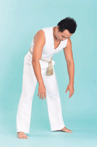 3. 再將身體向前彎,一面彎一面把身體裏的氣從口中吐出去,兩手手臂隨著身體的向前彎向前下垂。如此前後反覆共做九次。
