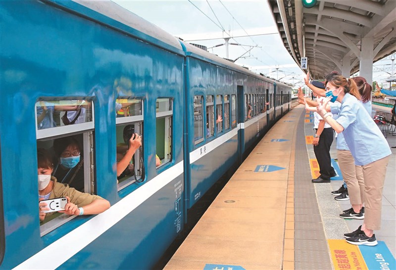 去年十二月停駛的藍皮普快列車,雄獅旅遊以「藍皮解憂號」觀光列車復駛,昨天首航。圖╱潘欣中