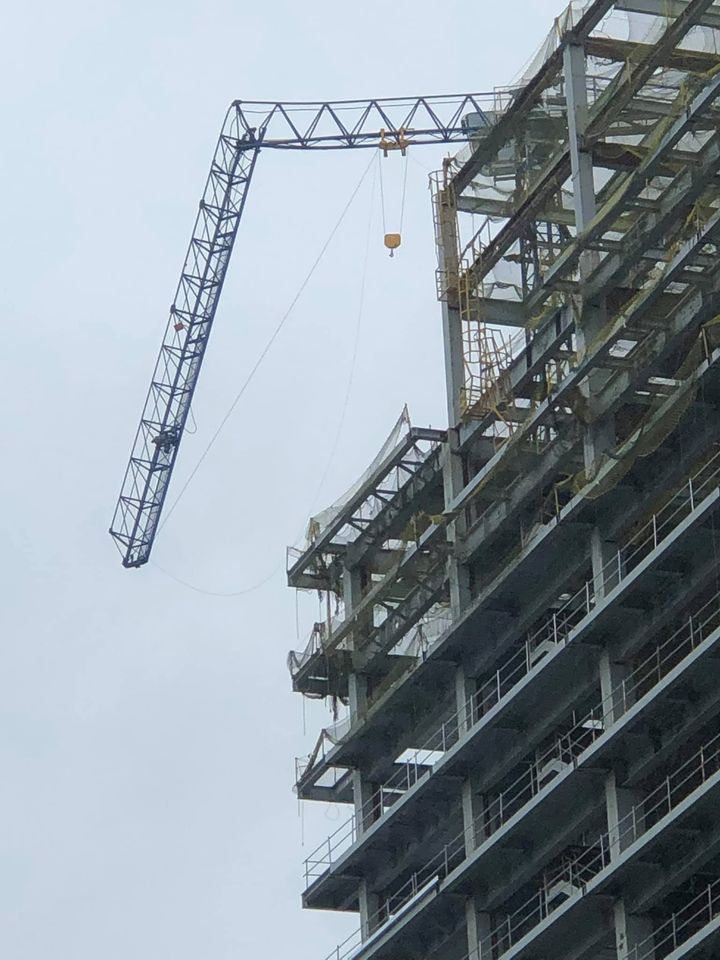 有民眾在臉書社團貼文,「地震太猛,宏匯附近的建案,高空搖臂折彎了」。圖/江婉儀翻攝