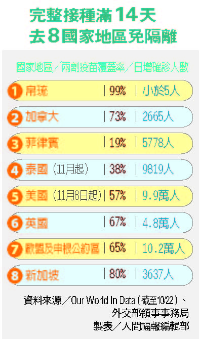 英國、歐盟或申根公約區、加拿大、新加坡、帛琉、菲律賓、泰國(11月起)、美國(11月8日起),台灣人「完整接種兩劑疫苗滿14天」,且「滿足該國入境檢測規定」,就能免隔離。不過,上述國家地區大多只認可AZ、莫德納、BNT、嬌生疫苗,僅帛琉認可高端疫苗。