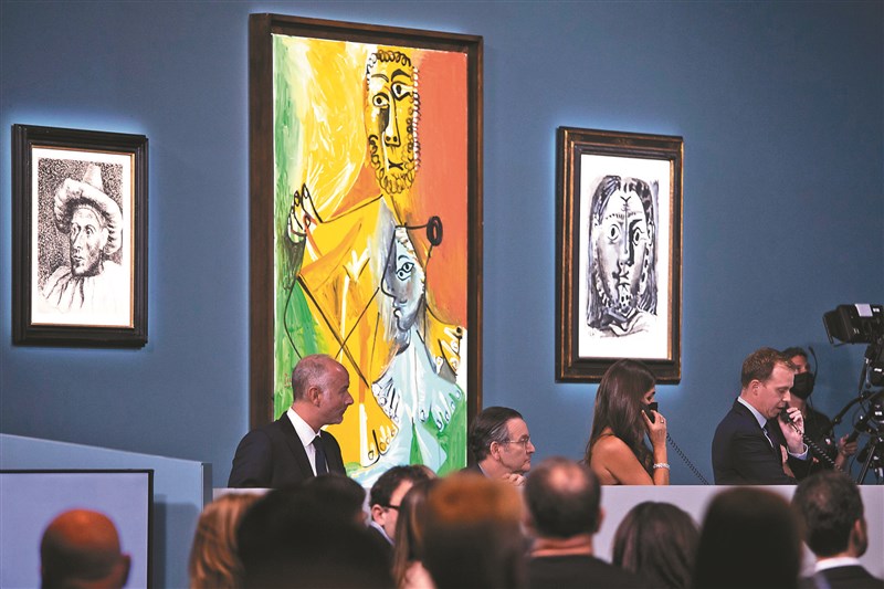在百樂宮酒店舉行的畢卡索畫作拍賣會上,買家和與會者正熱烈交流。圖/美聯社