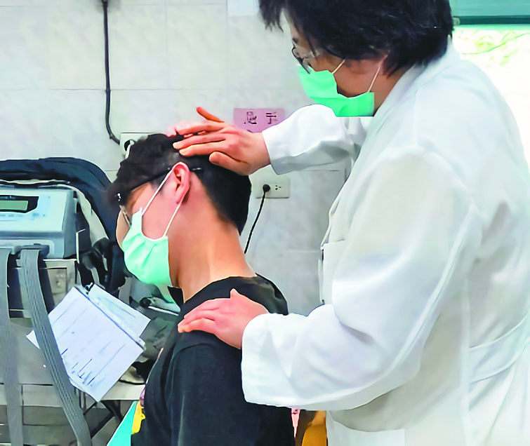 中榮埔里分院復健科物理治療生王繼貞說,罹患頸因性頭痛的患者經常誤以為頭痛是工作壓力太大造成的偏頭痛,沒察覺是因為脖子肌肉太緊繃所造成,而這類症狀只要常練習縮下巴,並改善坐姿讓耳垂、肩峰和髖關節成一直線,就可以有明顯改善。