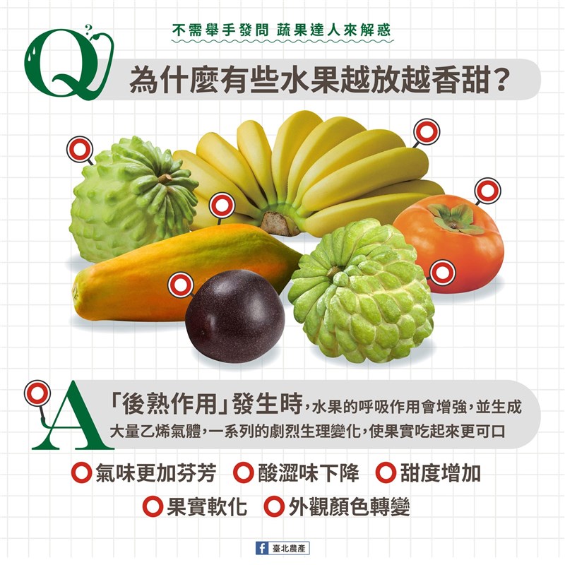有些水果會愈放愈香甜? 原因就在:「後熟作用」 |2021.10.25 語音朗讀 3645觀看次 字級 大 中 小 水果經過「後熟作用」會更加鮮甜美味。圖/unsplash 【記者楊旻芳台北報導】有一些水果剛買回來現吃覺得不怎麼甜,但放了幾天後再吃竟然「變甜了」,根據農委會解釋,原因就在於有些水果的特性有「後熟作用」,屬於更年性水果,因此採收後要放一下才會更鮮甜。圖/台北農產農委會指出,常見的更年性果實有釋迦、柿子、百香果、香蕉、木瓜、酪梨、洋香瓜、芒果、釋迦、蘋果、梨、桃、李、酪梨、柑桔類等都是。這些水果從產地新鮮採摘直接賣出,擺放兩三天會更鮮甜!水果買回家還沒有很熟可以放置2、3天吃會更加鮮甜。圖/unsplash原因在於「後熟作用」發生時,水果的呼吸作用會增強,並生成大量乙烯氣體,一系列的劇烈生理變化,會讓果實產生「香味更濃」、「酸澀味下降」、「甜度增加」、「果實軟化」、「外觀顏色轉變」,使果實吃起來更可口。那為什麼不等果實完熟了在採摘做販售呢?農委會解釋,原因有二,一是等到完熟才採收,容易被動物捷足先登採收;二是便於運輸貯藏和販賣時有較長的貨架壽命,提高農產上架時的品質。 前一篇文章 今本土+2、境外+6 AZ、BNT預估將加開48萬 下一篇文章 五分埔3992戶無預警大停電 台電:饋線高壓電纜故障 熱門新聞 01伊朗示威恐2萬死 川普:援助在路上2026.01.1502瑕疵品反爆紅 哭哭馬賣到缺貨2026.01.1403南亞偏鄉師參學新馬寺 交流創意教學法 2026.01.1404平價版人類洗澡機 預計年底開賣2026.01.1405日電鐵貴志站 任命第3代貓站長2026.01.1406重慶川普紅不讓 談旅遊給人歡喜2026.01.1407和韻新語國樂音樂會 佛館登場2026.01.1408星雲大師全集【傳記】百年佛緣─社緣篇 與佛菩薩感應記 4-22026.01.1409【我行遲遲】零下十四度的盛世2026.01.1410台美關稅 可望降至15%2026.01.14 訂閱電子報 台北市 天氣預報 台灣一週天氣預報 相關報導 台美關稅談判 鄭麗君今說明周折汪喵嘉年華 總統籲零棄養高雄新材料循環產業園區台半導體供應鏈 4成移美歷來最大手筆 台積今年資本支出 將逾500億美元台電技能競賽 1281名好手展技