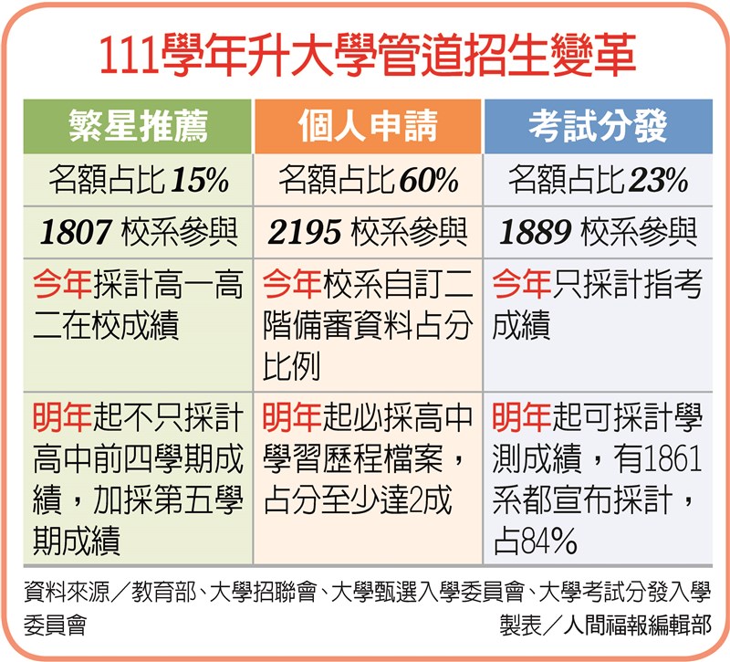 考試分發是每年最後一個升大學管道,大學考試入學分發委員會統計,111學年共62校、1889系在此管道開設名額,其中1861系都將採計學測考科,和往年不同。
