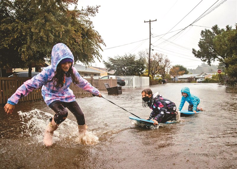 「炸彈氣旋」二十四日侵襲美國北加州,導致當地多處淹水並發生土石流。圖為孩童在淹水的道路嬉戲。圖/美聯社