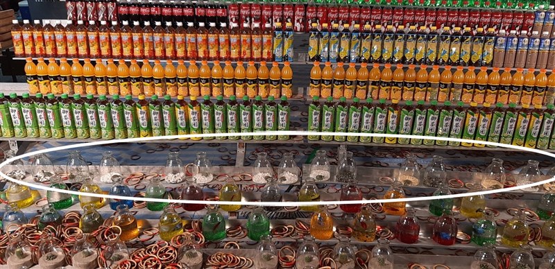 有民眾看見,夜市攤販將巴西龜放置狹小玻璃容器內,以獎品方式供民眾以套圈圈取得(白圈處)。圖/新北市動保處提供