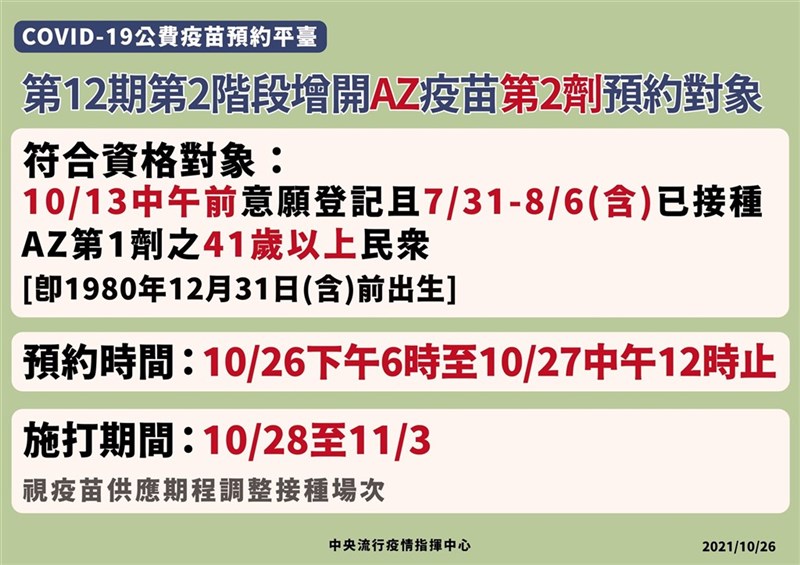 指揮中心下午發布新聞稿表示,為疫苗資源有效利用,「COVID-19公費疫苗預約平台」第12期第2階段將增加開放「10月13日中午前意願登記且7月31日至8月6日(含)已接種AZ第1劑的41歲以上民眾,即1980年12月31日(含)前出生」可預約接種第2劑。