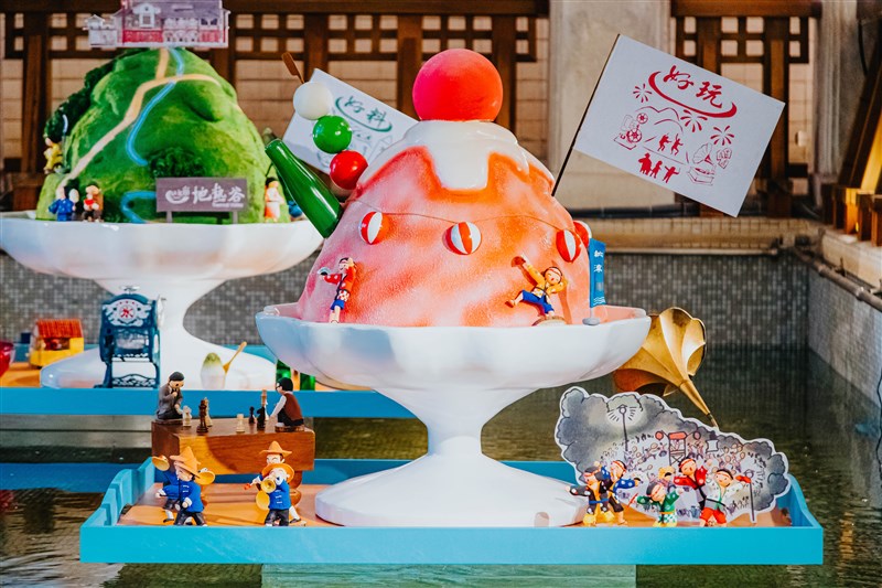 北溫館表示,特展「山丘下的北投盛會」將大浴池化為大型冰菓室,展出三座充滿懷舊風味的巨大刨冰讓觀眾暑氣全消,分別代表「北投好行」、「北投好玩」、「北投好料」的北投風景,色彩繽紛的刨冰雕塑有自動車、人力車、舞踊及蘇打水等可愛裝飾,呈現北投百年前最進步的交通建設、新興娛樂活動及多元的飲食料理,一旁還有復古攤位,讓民眾身歷其境,如同進入神隱少女般的奇幻世界,瞬間回到百年前北投的風華熱鬧時光。
