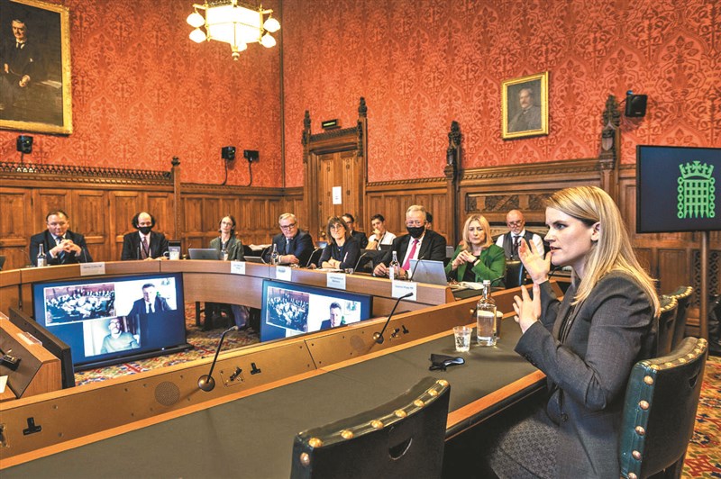 臉書「吹哨者」法蘭西絲.郝根(右)25日在英國國會作證,指出臉書對於內容管控不足。圖/美聯社