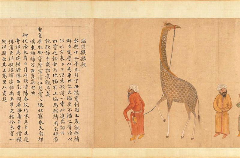 〈明人瑞應圖〉描繪榜葛剌使者進獻「麒麟」給永樂皇帝,當時的「麒麟」,是東非的長頸鹿;明朝的馬歡是鄭和船隊的阿拉伯語通譯官,他在《瀛涯勝覽》中記錄隨行所見所聞,成為今日了解鄭和船隊出使經過的最佳讀本。