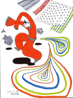「我一定能設計出花色更好的布料!」洪五加緊趕工,注意每個細節。