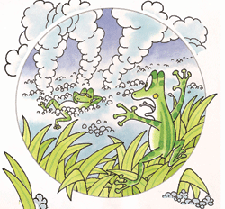ㄧ隻小青蛙無意間來到了池邊,發現池塘的美麗,還有水中的浮游生物,牠開心的不得了,回去告訴同伴們這個好消息。
