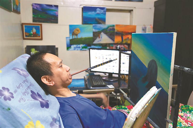 金根鴻重建自信成為專業畫家,如今能以畫作收入幫助更多偏鄉孩童。圖╱中央社