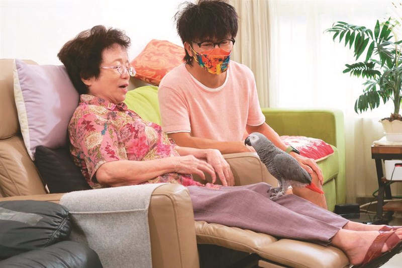 唐從聖(右)買了一隻鸚鵡,讓媽媽在兒女工作時,不會孤單。