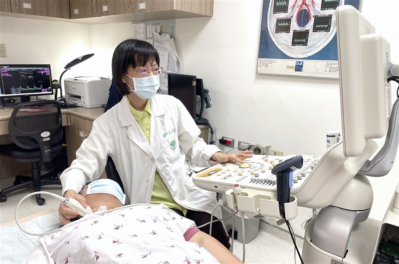 奇美醫學中心神經內科主治醫師葉珀秀利用「頸部動脈超音波」,觀測患者頸動脈硬化、鈣化與狹窄程度。圖/奇美醫學中心