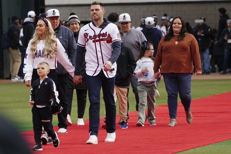 勇士球迷無不希望球團能把成為自由球員的佛里曼(中)簽回來,認為他已經是勇士代名詞。圖/美聯社
