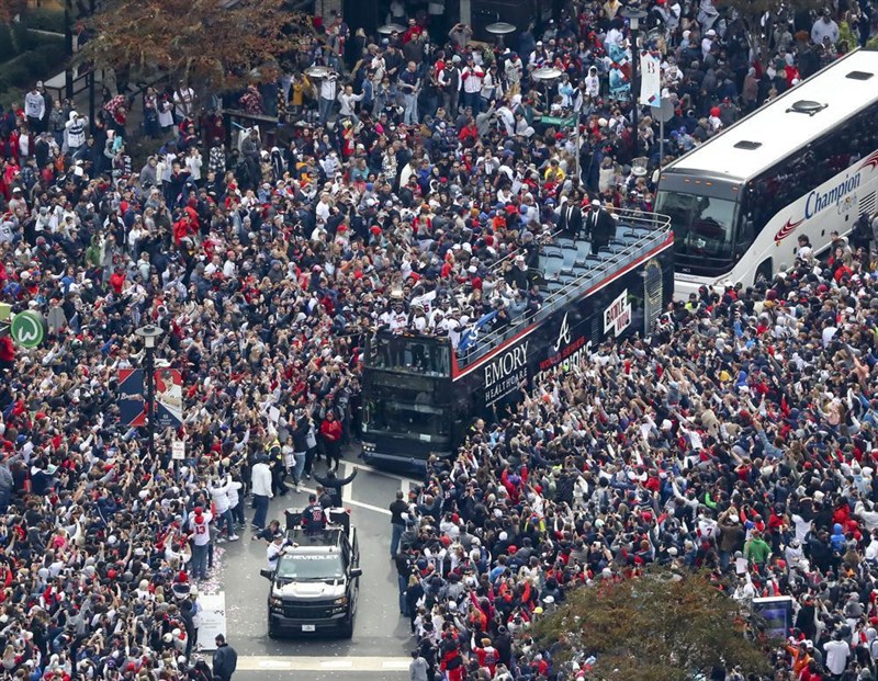 【記者張哲郢綜合外電報導】美國職棒亞特蘭大勇士隊2日在世界大賽以4勝2敗擊退休士頓太空人,拿到1995年後首冠,5日在亞特蘭大當地舉辦冠軍遊行,遊行隊伍被團團包圍,警方粗估至少有30萬人,勇士主席馬奎爾克(Terry McGuirk)則說超過百萬人參與。