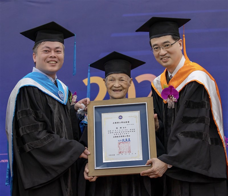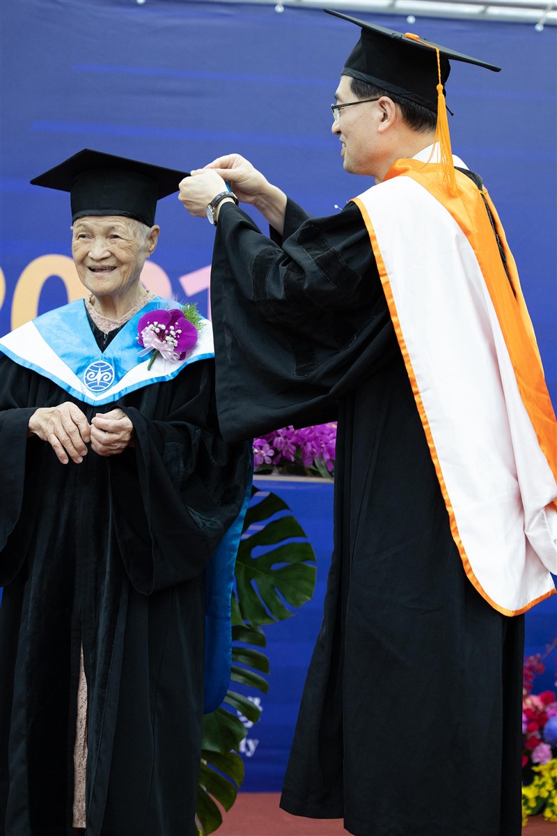 陳綢阿嬤獲頒暨南大學名譽博士。圖╱中央社