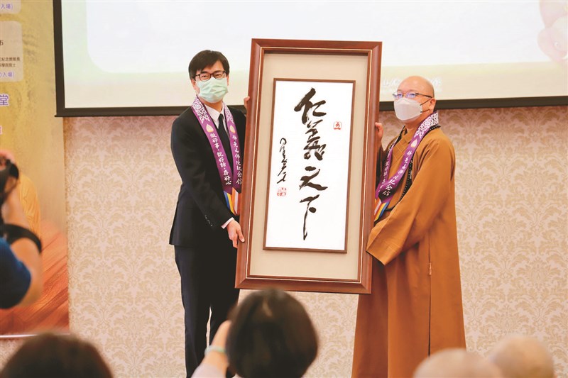 高雄市市長陳其邁(左)頒感謝狀,佛光山住持心保和尚(右)回贈星雲大師墨寶。圖/人間社記者梁清秩