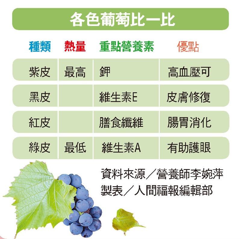 她表示,想要皮膚好可以吃黑皮葡萄、高血壓吃紫皮、減重可選綠皮;黑皮葡萄有較高含量的維生素E,幫助修護皮膚;紫皮葡萄熱量最高,但鉀離子也高,所以如果有高血壓,紫皮葡萄就會是個好選擇;綠皮葡萄是熱量最低的,同時也是維生素A含量最高的,維生素A對眼睛好,能協助修復黏膜組織,常感冒、有過敏體質的人,飯後水果就來點綠皮葡萄。