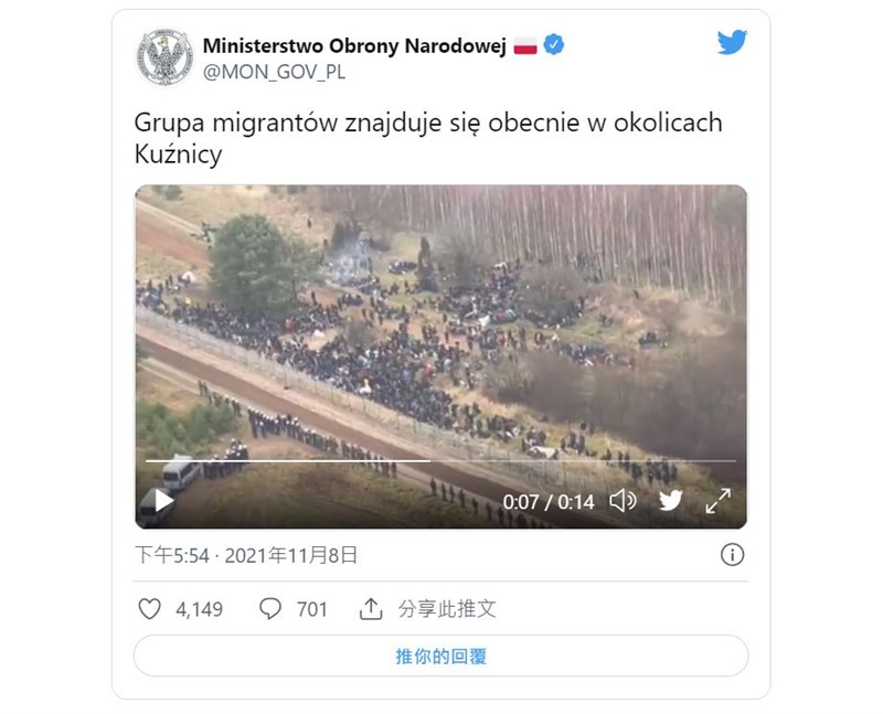 白俄羅斯放任非法移民湧波蘭邊界 立陶宛部署軍隊待命 |2021.11.09 語音朗讀 1141觀看次 字級 大 中 小 白俄羅斯被控放任非法移民前進歐盟,波蘭當局8日表示,白俄羅斯境內數以百計的移民正在前往波蘭邊界。圖/facebook.com/16DZOlsztyn 【本報綜合外電報導】白俄羅斯被控放任非法移民前進歐洲聯盟(EU)。波蘭當局8日表示,白俄境內數以百計的移民正在前往波蘭邊界;立陶宛則在與白俄邊境部署軍隊,以因應可能大舉湧入的移民。歐盟指控白俄羅斯總統魯卡申柯(Alexander Lukashenko)策動主要來自中東的移民和難民進入歐盟國家,以反擊布魯塞爾祭出的制裁。魯卡申柯則否認這些指控。波蘭特勤單位發言人札林(Stanislaw Zaryn)今天在推特(Twitter)轉推邊境移民影片。他表示:「來自邊界非常令人擔憂的訊息。一大群移民聚集在靠近與波蘭邊界的白俄羅斯。他們剛剛走向波蘭共和國的邊界。他們將試圖一起進入波蘭。」札林指出:「新的資訊顯示,團體(移民)受武裝白俄羅斯人嚴格控制。他們決定團體前往的方向。」波蘭內政部長卡明斯基(Mariusz Kaminski)在推特表示:「我們為任何情況做了準備。」他並說,華沙當局已在該地區增加了警察和軍人人數。根據法新社、路透社報導,白俄羅斯邊境防衛隊在聲明中證實,「一大群難民…正沿著高速公路向(白俄)與波蘭的邊界移動」。立陶宛內政部長畢洛泰特(Agne Bilotaite)指出,當局正派遣軍隊前往與白俄羅斯的邊界,以因應可能湧入的移民。畢洛泰特在記者會中表示,立陶宛內閣也將討論是否在與白俄邊境地區發布緊急狀態。基於安全原因,立陶宛當局拒絕透露軍人具體部署地點和人數。 前一篇文章 印度拚淨零排放 沙漠綠電助攻 下一篇文章 為和平!伊朗:核協議若恢復美要保證不再退出 熱門新聞 01【詩】與光行2026.01.1902【素人攝影】美夢成真 遇見幸福極光 2026.01.1803大陸絕美書店 奇幻閱讀旅程2026.01.1804營養師解析自律神經失調 李婉萍:吃對營養調回身體平衡感2026.01.1705聯合國示警 全球水資源破產2026.01.2206星雲大師全集⑳【佛教管理學②】佛教的「梵唄音樂」管理學⑧2026.01.1807海洋音樂家 鯨魚神祕吟唱2026.01.1808大學學測 計算量大數學A近年最難2026.01.1809【養眼專欄】 熱敷眼罩只有改善眼睛乾澀疲勞嗎?2026.01.1710小氣泡能量大2026.01.20 訂閱電子報 台北市 天氣預報 台灣一週天氣預報 相關報導 秦淮燈會大陸機器人 瑞士展身手川普推和平理事會 已22國加入 洛杉磯 反ICE韓前總理韓悳洙涉內亂罪 判囚23年黑龍江 現絕美極光