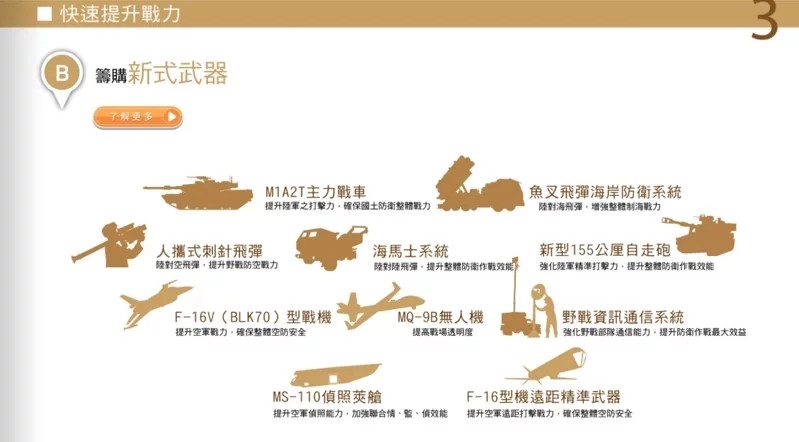 海軍部隊方面,則針對靈活、多能、機動、獨立作戰特性,海軍109年陸續增編快速布雷艇、岸置機動反艦飛彈車及高效能作戰艦艇換裝等單位,確保聯合制海作戰任務遂行。