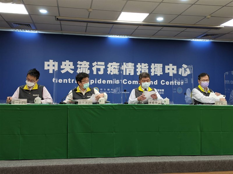 由左到右中央流行疫情指揮中心醫療應變組副組長羅一鈞、疫情監測組組長周志浩、指揮官陳時中、發言人莊人祥。圖/謝承恩