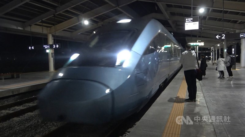 南韓國內首款高速動力分散式列車KTX-Eum今年起正式用於中央線及江陵線鐵路運輸。圖為KTX-Eum進站畫面。圖/中央社