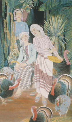 你,坐入偌大的大鵬華城的中庭花園長簷的長椅上,左撇的手,一把雨傘,放入雙腿一挾,左撇的手,拿著報紙,左邊椅角一放,在長椅前方的株株雨豆樹,行行美人木,簇簇蒲葵劍,所蔚成的青綠中,你,你呀,左撇手肘頂托無牙扁嘴的下顎,眼神渙散,隨著天上飄浮的聚散無常的流雲,放眼忽忽後,閉目冥思,撫然中靜止。
