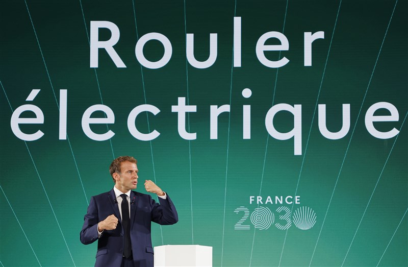 法國總統馬克宏10月12日公布「法國2030」投資計畫,當時背後寫的是「電力驅動」。圖/美聯社