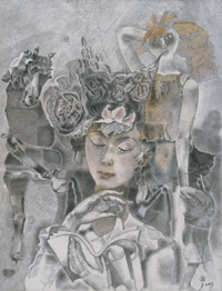 愛你成痴,想著:「若我有朝能裝飾你之額,最卑賤的花,將幻為豪華。」尤其在那麼熟悉的容貌、語調、左撇子的手勢,一副瘦肩,火熱騰騰的有著當年對我燃燒過的海誓、山盟,更何況看到你眼睛裡還有當年熱戀時的火花,有著一往深情的神采,是呀!你身上的藍,與台大當時穿的牛仔褲一致,切實有你的典型、個性和韻致。我愉悅地點頭一陣,伸手扶你。你慢慢站起,通體透明,有著:緩緩、啜飲而鼓起的信仰與美。