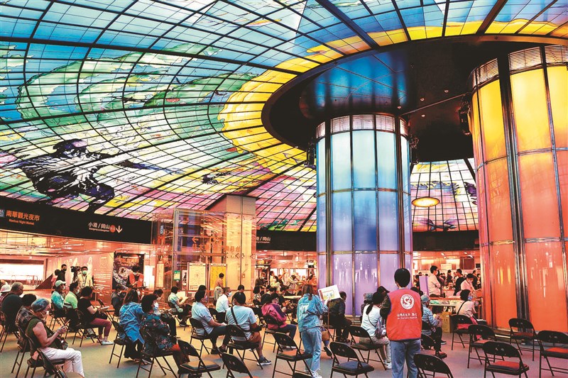 高雄捷運美麗島站內的「光之穹頂」是耀眼地標,為方便通勤民眾接種新冠疫苗,衛生局昨起一連四天,安排符合資格的民眾預約或隨到隨打。民眾說,抬頭仰望繽紛穹頂,接種時心情也愉悅。圖/高雄市政府提供