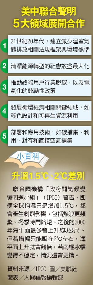 COP 26 強心劑 中美合作抗暖 |2021.11.12 語音朗讀 1140觀看次 字級 大 中 小 「聯合國氣候變化綱要公約第26屆締約方大會」(COP 26)接近尾聲之際,全球前兩大碳排放國家美國和中國大陸10日突然發表聯合聲明,表示將在未來10年攜手減緩全球暖化,確保這場在英國格拉斯哥(Glasgow)舉辦的氣候變遷峰會圓滿落幕。 圖/美聯社美中聯合聲明 5大領域展開合作 小百科 升溫1.5℃、2℃差別 資料來源/IPCC 製表/人間福報編輯部 美國總統拜登。圖/美聯社大陸國家主席習近平。圖/新華社 【本報綜合外電報導】「聯合國氣候變化綱要公約第26屆締約方大會」(COP 26)接近尾聲之際,全球前兩大碳排放國家美國和中國大陸10日突然發表聯合聲明,表示將在未來10年攜手減緩全球暖化,確保這場在英國格拉斯哥(Glasgow)舉辦的氣候變遷峰會圓滿落幕。這也是中國大陸首度同意抑制甲烷減排,呼應美國總統拜登與歐盟上周提出的甲烷減排倡議,大陸也允諾自2026年起逐步汰除燃煤。強化氣候行動 各界盛讚中國氣候變化事務特使解振華10日在記者會宣布,與美國達成的聯合聲明「2020年代加強氣候行動宣言」,稱中美兩國將重申《巴黎氣候協定》限制升溫目標的重要,即將全球平均氣溫較工業化前水平的升幅,控制在2℃內,並盡可能控制在1.5℃內。美國氣候特使柯瑞(John Kerry)同日也在記者會上稱,該宣言「讓我們得以在此基礎上邁出一步,有助結束排放量與目標的差距。」柯瑞說,美國和中國存在諸多差異,但在氣候議題上,合作是把事情做好的唯一出路。美中特使10日均表示,該聯合宣言是中美外交人員過去一年來,歷經線上與線下36場協商後的成果。聯合國祕書長古特瑞斯(Antonio Guterres)10日推文,對美中聯合聲明表示歡迎,「應對氣候變化危機需要國際合作與團結,這是邁向正確方向的重要一步」。歐洲聯盟(EU)氣候政策主席提孟思提孟思(Frans Timmermans)也表示,樂見美中聯合宣言,「這有助各國在這場氣候峰會上達成協議」。雙方召開會議 共推減排 中美聯合聲明內容指出,雙方除將推動減少二氧化碳排放,兩國還計畫在2022年上半年共同召開會議,聚焦強化甲烷測量和減排具體事宜,包括通過標準減少來自化石能源和廢棄物行業的甲烷排放,以及通過激勵措施和項目減少農業甲烷排放。甲烷是僅次於二氧化碳的第二大溫室氣體,但吸收熱能的能力比二氧化碳高,在大氣中分解的速度也更快,這代表降低甲烷排放可對控制全球暖化產生快速影響。 不過,該聯合宣言並未公布更多細節,例如沒有明確中國的碳排放量何時達到頂峰,目前中國計畫在2030年之前開始減少碳排放。柯瑞表示,中方承諾會加速制定計畫,減少甲烷排放,並在可行範圍盡快減少煤炭使用。中國是全球最大碳排放國,但大陸國家主席習近平卻拒絕參加格拉斯哥峰會,打擊了國際社會協議減少溫室氣體排放,扭轉災難性全球暖化的雄心。美中這項令人意外的聯合宣言,對於瀕臨失敗的協商談判無疑是一劑強心針。小百科升溫1.5℃、2℃差別聯合國機構「政府間氣候變遷問題小組」(IPCC)警告,即便全球均溫只是增加1.5℃,都會產生劇烈影響,包括熱浪更頻繁、冬季時間縮短,之後的2000年海平面最多會上升約3公尺。但若增幅只能壓在2℃左右,海平面上升就會翻倍,若南極冰帽變得不穩定,情況還會更糟。 前一篇文章 美國大學學費 40 年飆漲 169 % 下一篇文章 率網軍侮辱外交官 楊蕙如判刑 6 月 熱門新聞 01土方之亂推高成本 房價漲壓浮現2026.02.0202【遨遊藝事】巴黎 黛瑪兄弟茶館(Dammann Frères)2026.02.0603向前有路 光明在望2026.02.050410年前震倒115死 台南維冠改建防震7級大樓2026.02.0605菜市場變書房 攤商兒放學安心讀2026.02.020630冊佛教徒必讀經典 台北書展亮相2026.02.0407極樂寺彩繪燈籠 三好理念廣傳校園2026.02.0408長照3.0 重點聚焦醫療結合長照2026.02.0409佛教藝文本土化 昆士蘭美術館團隊訪中天寺2026.02.0510立春養生疏肝理氣 飲食調養少酸多甘2026.02.04 訂閱電子報 台北市 天氣預報 台灣一週天氣預報 相關報導 WBC中華隊 旅外戰力強悍 台積熊本二廠升級3奈米 魏哲家拜會高市習川通話 白宮:美對台政策未變手作布偶減塑 童玩邁向永續川普稱莫迪停買俄油 美降印度關稅至18%最清澈湖泊告急 外來藻入侵