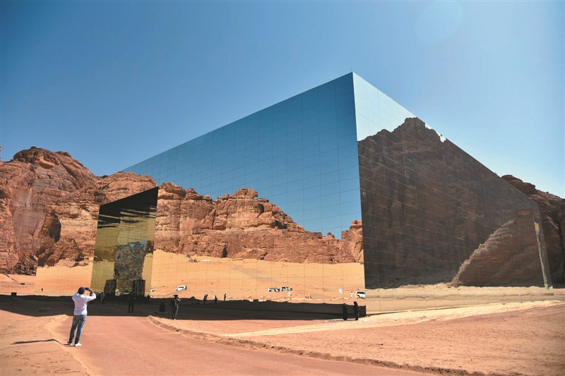 沙烏地阿拉伯古城歐拉迎來冬季旅遊季,歐拉位於沙烏地阿拉伯西北部,歷史可以追溯到公元前六世紀。沙烏地阿拉伯第一個世界文化遺產地:石谷考古遺址,就位於歐拉,兩千多年前納巴泰人在巨大岩石上開鑿的宮殿、墓穴和廟宇等保存至今。圖為五日拍攝的沙烏地阿拉伯古城歐拉的鏡面藝術建築「邁拉亞」。圖/新華社