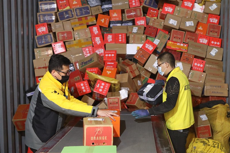 圖為大陸一家快遞業者位於河北省廊坊市的轉運中心,工作人員11月11日當天忙著處理大批包裹。圖/中通社