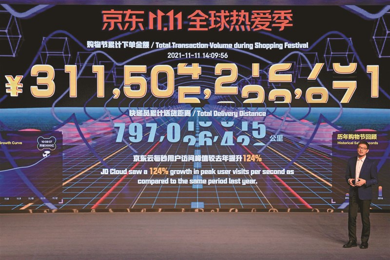 電商平台京東消費與產業發展研究院院長劉輝,在總部展示「雙11」的實時銷售數據。圖/美聯社