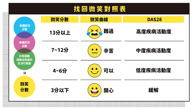 類風溼性關節炎無法根治,醫師建議善用「一分鐘微笑量表」,透過良好的醫病溝通,畫出屬於自己人生的微笑曲線。圖/風溼病基金會台灣抗風溼聯盟