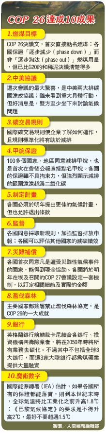 格拉斯哥協定出爐 氣候峰會 首度明定少用燃煤 |2021.11.15 語音朗讀 1217觀看次 字級 大 中 小 COP 26協議各國須在2022年底前強化「2030年減排目標」。圖為世界首座也是最大的碳捕捉和轉化工廠「Orca」,今年9月8日在冰島啟用。圖/美聯社COP 26 達成10成果 製表/人間福報編輯部COP 26在英國籍主席夏瑪(中)發表總結性演講後順利落幕,現場人員紛紛鼓掌。圖╱法新社 【本報綜合外電報導】「聯合國氣候變化綱要公約第26屆締約方大會」(COP 26)13日落幕,近200個國家、地區的代表經過15天的馬拉松式談判,首次明定將減少使用煤炭,各國須在2022年底前強化「2030年減排目標」,加速分階段削減「未使用碳捕捉技術的燃煤發電」以及淘汰「無效率的化石燃料補貼」;雖然協議措辭力道減弱,但《格拉斯哥氣候協定》成為歷來第一份提及化石燃料的聯合國氣候協議。本次會議原本12日就要結束,但在最後關頭陷入膠著,主要關鍵點在於原本要達成的協議,是要訂下分階段停用煤炭(phase out)的目標,但是仰賴廉價煤炭發電發展經濟的中國大陸、印度強力反對,認為「終結煤炭」的做法沒有考慮發展中國家的福祉,最終將草案中的「分階段淘汰」,改為較消極的「分階段削減」(phase down)煤炭用量。淘汰改為削減 妥協達成共識這樣的修正使面臨全球暖化海水上升可能「滅國」的大洋洲國家強烈抗議,英籍會議主席夏瑪(Alok Sharma)含淚表示他非常遺憾這樣的結果,但這是為了達成共識所必須做的妥協;美國氣候特使柯瑞(John Kerry)也表示,各國政府別無選擇,只能接受印度對煤炭措辭的改變,「若不這麼做,就沒有協議」。國際智庫能源過渡委員會(Energy Transitions Commission)估算,在本次會議之前,全球到2030年預計會排出5240億噸的碳排放,這次的COP 26會議成果,將使碳排放減至4190億噸,但仍遠超過必須把增溫降在1.5℃之內所需的2660億噸目標,多出了整整57%排碳量,可能使全球均溫比工業革命前上升2.4℃。峰會尾聲,各國代表破天荒列出對煤炭的約束條件,不只制定國際碳排放額度交易規則,也要求汙染大國明年與會時提出更好的保證,致力於減排。科學家呼籲減排遏止暖化,但各國仍以國內政治與經濟為優先要務;格拉斯哥會談之前,聯合國訂定3個成功標準,結果1個都沒達成。這3個標準分別是2030年前減少全球二氧化碳排放達半數、富國援助窮國1000億美元(約新台幣2.7兆元),並確保半數資金用於協助開發中國家適應氣候變遷最糟的影響。強化巴黎協定 峰會可喜成果英國《金融時報》認為,峰會取得的成果多過預期,但不及原先希望,不過1年後各國若提交更雄心勃勃的減排計畫,全球升溫仍可能控制在1.5℃之內。峰會更在數個方面上強化《巴黎氣候協定》,首先是認識到1.5℃目標的重要性,科學界也有了2030年碳排須減半,以及2050年達成淨零碳排的共識。與會各國最終批准讓《巴黎氣候協定》運作更加透明與有效的規範,顯示全球在必須應對氣候變遷的態度上持續加速轉變。 前一篇文章 碳市場機制 釋出數兆美元加速減排 下一篇文章 攸關中美未來 拜習會 台海和平成焦點 熱門新聞 01土方之亂推高成本 房價漲壓浮現2026.02.0202【遨遊藝事】巴黎 黛瑪兄弟茶館(Dammann Frères)2026.02.0603向前有路 光明在望2026.02.0504菜市場變書房 攤商兒放學安心讀2026.02.0205極樂寺彩繪燈籠 三好理念廣傳校園2026.02.040610年前震倒115死 台南維冠改建防震7級大樓2026.02.0607佛教藝文本土化 昆士蘭美術館團隊訪中天寺2026.02.0508兩岸新聞營師生 認識人間佛教2026.02.050930冊佛教徒必讀經典 台北書展亮相2026.02.0410立春養生疏肝理氣 飲食調養少酸多甘2026.02.04 訂閱電子報 台北市 天氣預報 台灣一週天氣預報 相關報導 日本今大選 民調估自民黨眾院單獨過半冬奧開幕 首創4地連線進場 WBC中華隊 旅外戰力強悍 台積熊本二廠升級3奈米 魏哲家拜會高市習川通話 白宮:美對台政策未變手作布偶減塑 童玩邁向永續