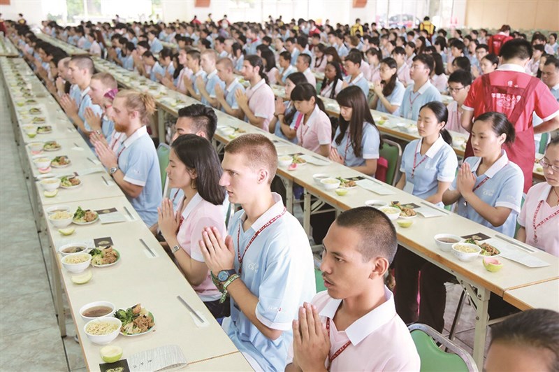 佛光山雲居樓一、二樓沒有柱子,可同時容納千人食宿及舉辦活動展覽。圖為國際青年生命禪學營學子於一樓齋堂體驗過堂。