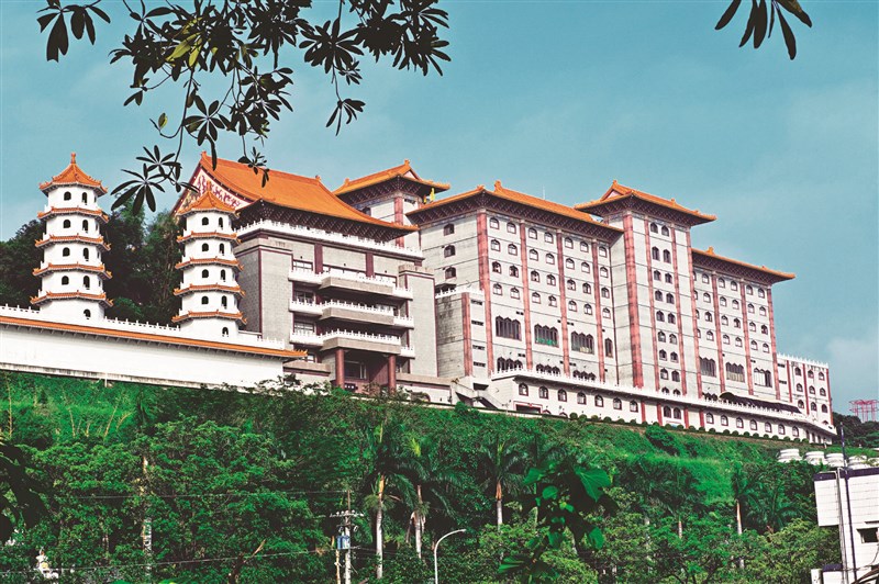佛光山每棟建築物都有其往昔因緣與意義,興建過程歷經困難挫折,終成今日與大眾結緣的空間。圖由右至左為佛光山雲居樓、傳燈樓和七寶塔。圖/資料照片
