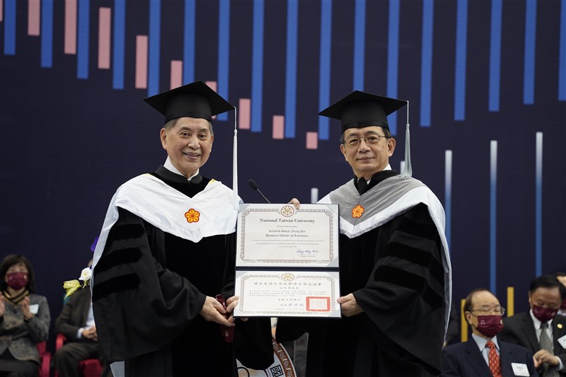 國立台灣大學今天舉行創校93年校慶慶祝大會,校長管中閔(右)致贈名譽博士學位給臺大文學院特聘講座教授白先勇(左),以表彰其卓越的成就與貢獻。圖/台大提供