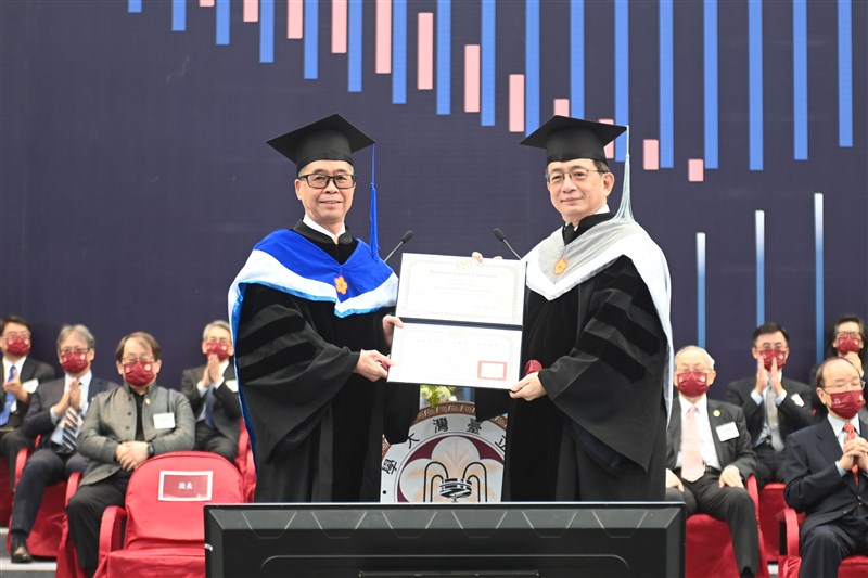 台灣大學今天舉行創校93年校慶慶祝大會,校長管中閔(右)致贈名譽博士學位給聯發科董事長蔡明介(左),以表彰其卓越的成就與貢獻。圖/台大提供