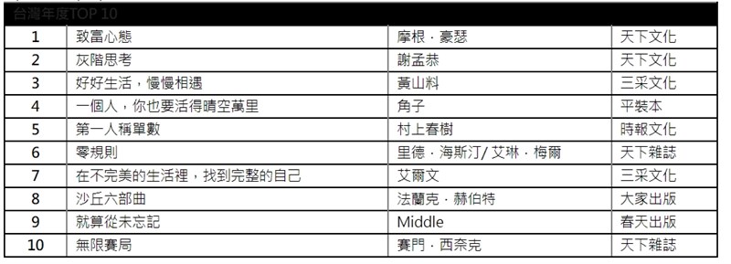 誠品2021十大暢銷榜公布 財富自足、心靈富足為疫情時代閱讀趨勢 曹麗蕙 |2021.11.15 語音朗讀 1092觀看次 字級 大 中 小 誠品書店公布2021年度Top 10暢銷榜,「投資自我」提昇理財能力及心靈的富足,成為全台讀者的想望。圖/誠品書店提供 【記者曹麗蕙台北報導】誠品書店今公布2021年十大暢銷榜,提昇理財能力及心靈富足,成為在疫情時代全台讀者想望,其中摩根豪瑟《致富心態》帶著零經驗的新手學習理財,獲最多讀者青睞,榮登暢銷冠軍寶座;「一件襯衫」創辦人黃山料《好好生活,慢慢相遇》教讀者如何面對、理解並善待真實的自我,才有力氣追求想望的目標,也擠進TOP3。後疫情時代也迎來「新常態生活」,影劇熱潮席捲全球,Netflix成功法則受矚目,Netflix創辦人里德海斯汀現身說法的《零規則》也攻佔暢銷榜TOP6。2021誠品書店年度暢銷TOP1《致富心態》 。圖/誠品書店提供誠品書店表示,疫情尚未停歇的這一年,許多人嘗試在困境中探索可能,「財富自足」與「心靈富足」,成為大家追求的目標。除了TOP1的《致富心態》,Podcast人氣節目股癌製作人謝孟恭的《灰階思考》以淺顯易懂的觀念提醒讀者理財應有多元開放的心態,也高居TOP2。在追求心靈富足趨勢上,還可以看到擁逾11萬粉絲的YouTuber艾爾文,在新書《在不完美的生活裡,找到完整的自己》分享面對困境的許多故事,讓人生的各種可能都值得期待,獲第七名。「文字閨蜜」角子《一個人, 你也要活得晴空萬里》以細膩、溫暖的文字開導人生煩惱,讓一個人獨處時不再只是悲傷,而是沈澱的美好契機,獲TOP4佳績;另外,暢銷作家Middle短篇小說集《就算從未忘記》透過20個埋藏心底的故事,懷念那些曾經的情感,溫暖語錄療癒心靈,名列榜單第九名。2021誠品書店年度暢銷TOP3《好好生活,慢慢相遇》 。圖/誠品書店提供另一方面,後疫情時代,宅家追劇成為放鬆、打發時間首選,進一步讓影音平台Netflix的成功也受矚目,獲TOP6的《零規則》即由Netflix創辦人里德海斯汀現身說法,首次揭露經營準則,分享如何突破規矩限制、掌握新運作法則,顛覆大家對工作的全新想像。2021誠品書店年度暢銷TOP6《零規則》。圖/誠品書店提供電影熱潮席捲全球、被譽為「科幻小說聖經」的《沙丘六部曲》,內容融合科學事實、環境保護主義等,跳脫科幻小說常見故事劇情,曾獲雨果獎、星雲獎,這次也登上誠品書店暢銷榜TOP8。誠品書店2021年度新書不分類暢銷TOP10(統計期間:2020/11/01-2021/10/31)。圖/誠品書店提供 前一篇文章 棒球/大專聯賽移師台東 97校123隊參與創新高 下一篇文章 高端認證國家又縮減? 莊人祥:維持4國 熱門新聞 01【印象旅人】阿里山森鐵首航記2026.04.1102人口持續減少 今年新生兒恐跌破9萬 2026.04.1103螢光花泉季 卡比胖拉超療癒2026.04.1104鄭習會 鄭:兩岸和平制度化2026.04.1105【口腔健康攸關長壽】 張添皓:從齒啟動全身保健2026.04.1106【養眼專欄】 糖尿病為何讓視力忽近忽遠?2026.04.1107洗衣機新過濾系統 捕捉9成微塑膠2026.04.1108MLB太空人打敗洛磯 鄧愷威中繼成功2026.04.1609佛光大佛供奉法華塔與《法華經》信仰意涵2026.04.1210紐約曼哈頓 豆梨花盛開2026.04.11 訂閱電子報 台北市 天氣預報 台灣一週天氣預報 相關報導 恢復兩岸航點 陸委會:無迫切必要跨域載具AI智慧安全系統 亮相3展聯合開幕 聚焦電動、氫能車賴總統4月22日出訪史瓦帝尼大型建案強制裝光電 藍提案喊卡鄭:若執政 恢復兩岸故宮交流 作者其他文章普門品交響清唱劇妙法之歌 5月12日中山堂首演故宮「獨騷」書畫展 探索屈原魅力 范振金特展 呈現半世紀窯變台灣工藝3專書 呈現文化獨特樣貌故宮特展神獸再現 麒麟、鳳凰登場 沉浸式共織宇宙 在新北美術館