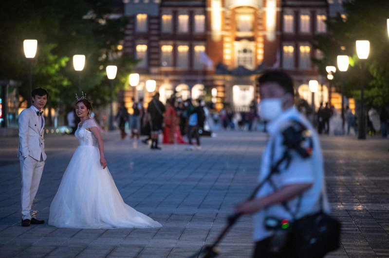 新冠疫情不但改變許多人生活,也影響結婚,圖為5月23日一對新人,在東京街頭拍攝婚紗照。圖/法新社