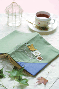 楓香葉片像是隱藏了許多故事,僅僅一片葉子就非常吸引人。我運用不同的手縫技巧呈現楓香葉片,並利用長短交錯的平針縫,繡出可愛的圓形蒴果和掌狀裂葉。