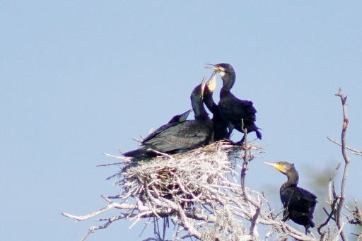 從築巢孵蛋至今到,每天吸引鳥友觀察守護,攝影師林言順說,鸕鶿親鳥賢伉儷輪流育雛,一對小鸕鶿長得很快,鸕鶿父母忙捕魚餵食輪流照顧小鸕鶿,雛鳥破殼由雙親餵養,親鳥張大嘴,雛鳥將嘴伸入到親鳥的咽部,從親鳥食管取食半消化魚,通常經親鳥哺餵50至60天後,雛鳥就可離巢。