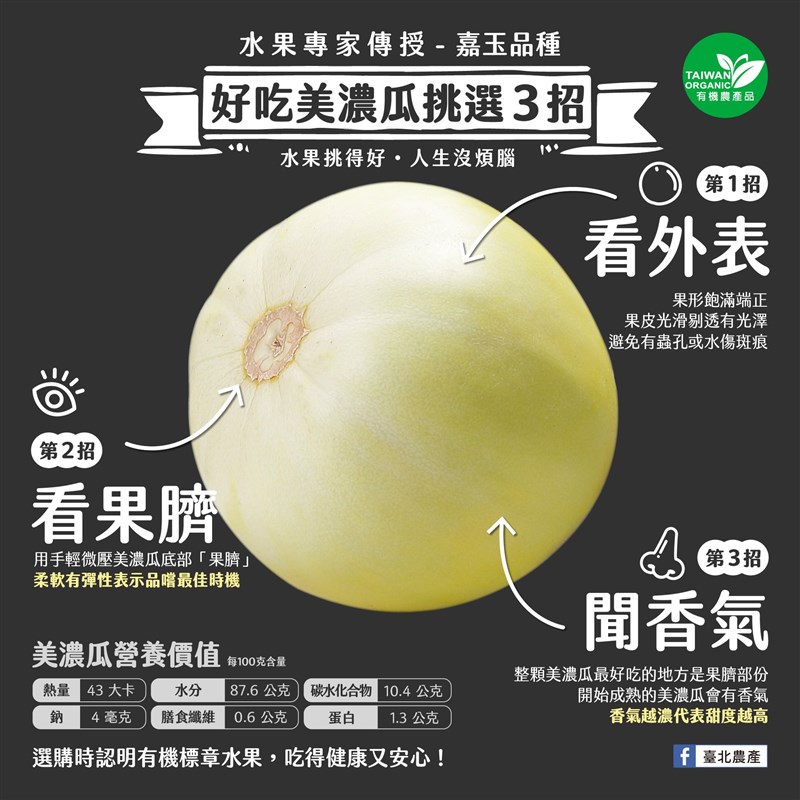 美濃瓜挑選3招 好吃祕密在果臍 |2021.11.16 語音朗讀 2285觀看次 字級 大 中 小 美濃瓜挑選3招,好吃祕密在果臍。圖/廖炯程提供 【記者楊旻芳台北報導】美濃瓜好吃香甜又清爽,不過雖然叫做「美濃瓜」,但它的名字可不是因為來自高雄的美農唷!美濃瓜是是因為英文學名叫做Melon,直譯過來變成美濃。美濃瓜果實含醣類、蛋白質、脂肪、有機、磷、納等,但瓜蒂味苦有毒,除供藥用外,不宜食用,美濃瓜除鮮食外,也可以加工醃曬製成醬菜、製成涼拌脆瓜或煮湯料量都是很美味的食材。新莊公有市場的賣菜郎廖炯程分享選購美濃瓜重點就是看它底部的「果臍」,選購3招快收藏。廖炯程分享甜瓜又分為「美濃瓜」、「洋香瓜」、「哈密瓜」。美濃瓜也俗稱香瓜,梨仔瓜,是「東方甜瓜」中的一種,特色是果皮較薄,不論品種果肉都是淡白綠色的香瓜。廖炯程說,美濃瓜甜度都在12度以上,所以有時候吃完上顎或是喉嚨會怪怪癢癢的,因為高甜度會導致黏膜脫水,鹽水漱漱口,過一陣子就沒問題了!圖/廖炯程提供美濃瓜的籽可以吃 促進消化而香瓜的籽其實是可以吃的,是很好的膳食纖維來源,刺激腸胃蠕動,助排便的神奇功效呢。不過他說,相信說完大家還是不會吃。美濃瓜怎麼挑?圖/台北農產第1招:看外表果形外觀完整,不要風括斑,靠傷、蟲孔或水傷斑痕。相同大小越重的越好。第2招:看果臍看一下底部的肚臍仔,越大越凸肚臍的越好。肚臍堅硬的可以多放幾天,微微軟的就是可以吃了。圖/廖炯程提供第3招:聞香氣整顆美濃瓜最好吃的地方是果臍部份,開始成熟的美濃瓜會有香氣,聞起來清香還可以放,聞起來香氣越濃代表甜度越高。 前一篇文章 英國擴大疫苗追加劑接種計畫 籲40到49歲成人施打 下一篇文章 想要孩子智商高、長得好 孕期不可缺碘 熱門新聞 01MLB太空人打敗洛磯 鄧愷威中繼成功2026.04.1602澱粉食物 口感變化有祕訣2026.04.1303蔬食技巧 不吃肉也能補足蛋白質2026.04.1304法全票通過 掠奪文物歸還中國2026.04.1705【深深思念】把悲傷 穿在身上2026.04.1406勞動部將研議 勞退舊制移入新制2026.04.1807佛光山線上佛學院開學 逾百學員雲端共學2026.04.1508《浩瀚星雲》大阪海外首演 轟動滿座 2026.04.1409預備檀講師研習 傳播人間佛教正能量2026.04.1410高市國稅局長訪佛光山 認識人間佛教2026.04.13 訂閱電子報 台北市 天氣預報 台灣一週天氣預報 相關報導 美議員籲立院 通過國防預算恢復兩岸航點 陸委會:無迫切必要跨域載具AI智慧安全系統 亮相3展聯合開幕 聚焦電動、氫能車賴總統4月22日出訪史瓦帝尼大型建案強制裝光電 藍提案喊卡