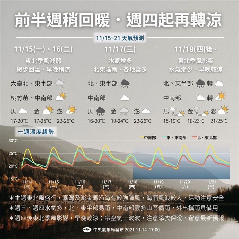 氣象專家賈新興也在臉書上提醒,今日白天氣溫回升,22-25日,受到東北季風或大陸冷氣團影響,北部及東北部氣溫下降,23-24日轉乾冷,「小心地球踢被子」。另也會持續觀察11月下旬第一波大陸冷氣團影響的機會,以及東亞冬季風偏強及持續的時間。