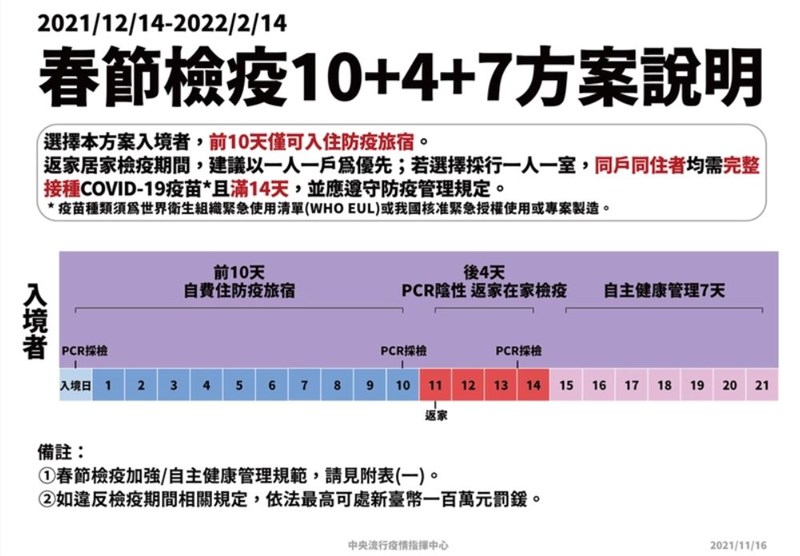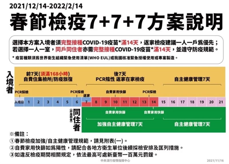 春節返鄉檢疫3方案 「14+0」只能入住防疫旅館 |2021.11.16 語音朗讀 1678觀看次 字級 大 中 小 春節返鄉檢疫將於12月14日至明年2月14日採三方案並行,選擇「14+0」方案只能入住防疫旅宿,「7+7」方案的入境者務必要接種二劑疫苗。圖/陳嘉寧 【本報台北訊】農曆春節將至,返鄉檢疫將於12月14日至明年2月14日採三方案並行,中央疫情指揮中心今(16)日公布詳細的「14+0」、「10+4」、「7+7」各項檢疫規定及資格,發言人莊人祥表示,「7+7」方案的入境者務必要接種二劑疫苗,若期間違反居家檢疫相關規定,最高可罰一百萬元。莊人祥說明,選擇「14+0」方案只能入住防疫旅宿,入境當天、第14天都要採檢一次PCR篩檢,若陰性即可進行7天自主健康管理,最後在自主管理倒數2天使用家用快篩,有篩檢結果會透過雙向簡訊通報,若快篩陽性要配合採檢安排和匡列措施。至於選擇「10+4」方案可在前十天入住防疫旅宿,後四天其同住者都要接種滿14天,且入境和第10天都要PCR採檢,陰性才能返家,最後才是7天自主健康管理,在家裡檢疫期間在第13天、第14天也會由衛生局安排PCR採檢。圖/指揮中心最後則是「7+7」方案,與「10+4」不同在於入境者一定要接種兩劑滿14天,入境後也可以一人一戶優先,如果一人一室居家檢疫,同住家人也需要完整接種滿14天。莊人祥表示,根據入境前七天算法是需在旅館滿待滿168小時,另外在入境當日、第六至七日要安排PCR篩檢,陰性即可反家。同住者加強自主管理與自主管理有不同之處,要完全遵照規定,也不能居家檢疫者共用房間衛浴或共食,沒任何症狀可外出,但不能搭大眾運輸,也不能去擁擠場所,需要落實實聯制,並紀錄每日活動,同住第三天、第七天都要家用快篩,如違反規定,最高可罰處新台幣一百萬元罰鍰。圖/指揮中心圖/指揮中心 前一篇文章 無薪假逾2.5萬人 邊境未開旅遊業短期難復甦 下一篇文章 第15輪混打約97萬人符合資格 BNT、莫德納都開放 熱門新聞 01法全票通過 掠奪文物歸還中國2026.04.1702MLB太空人打敗洛磯 鄧愷威中繼成功2026.04.1603勞動部將研議 勞退舊制移入新制2026.04.1804佛光山線上佛學院開學 逾百學員雲端共學2026.04.1505【詩】靜寂 2026.04.170645%失智症可預防 類黃酮食物護大腦2026.04.1607多倫多佛光山寺院體驗營 青年探索內心2026.04.1608【詩】春天的孤挺花2026.04.1609星雲大師紀念特展 紐西蘭一館開幕 2026.04.1610新馬寺領袖培訓營 小學生奮起飛揚2026.04.15 訂閱電子報 台北市 天氣預報 台灣一週天氣預報 相關報導 陸惠台措施 商總:利民就該開放台灣引領轉型AI Google肯定天龍演習 揭密機艙美議員籲立院 通過國防預算恢復兩岸航點 陸委會:無迫切必要跨域載具AI智慧安全系統 亮相