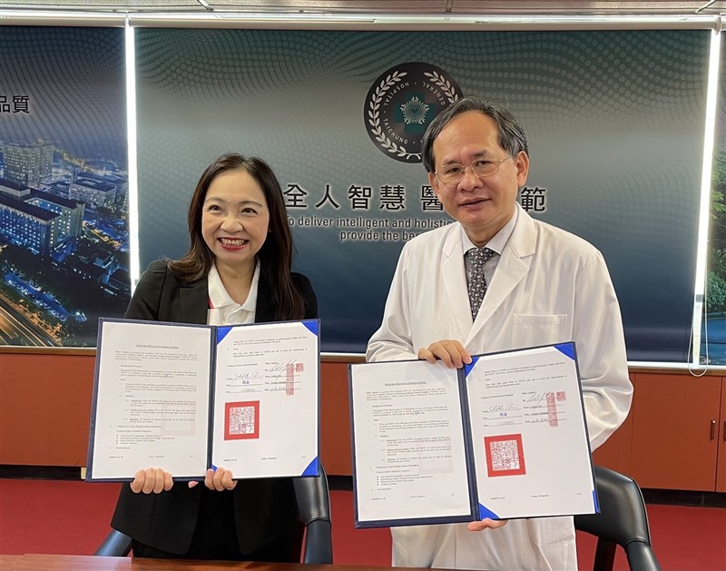 台中榮總院長陳適安(右)、台灣輝瑞大藥廠總裁葉素秋(左),於「罕見疾病基因治療中心」簽約儀式合影。圖/台中榮總